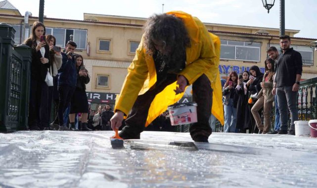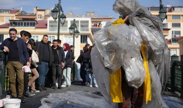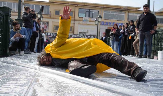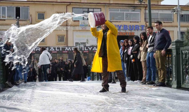 Etkinliğe ilgi gösteren öğrenciler ve vatandaşlar da performansa dahil oldu. Katılımcılar, kovalarla aldıkları suyu Kavukcu'nun üzerine dökerek eyleme destek verdi.