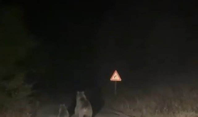 Bir süre yolda ilerleyen ayılar, koşuşturmaktan yorulunca arkasından gelen araca ters bakışlar attı. Anne ayı, arka ayakları üzerine dikilerek yavrusunu korumak amacıyla gövde gösterisinde bulundu. Anne ayının hareketini yavru ayı da tekrarlayarak, araçtakileri korkutmaya çalıştı. Bu anlar, Şamil Koçak isimli vatandaş tarafından cep telefonuyla kaydedildi.