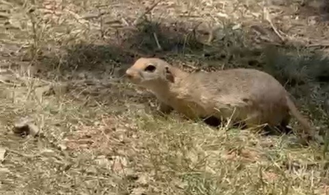 Anadolu yer sincabı, bu kez doğada yiyecek ararken görüldü. Bir süredir bölgede gözlemlenen sincap, toprağı eşeleyerek yiyecek aradıktan sonra arka ayakları üzerine kalkarak çevresini kontrol etti.