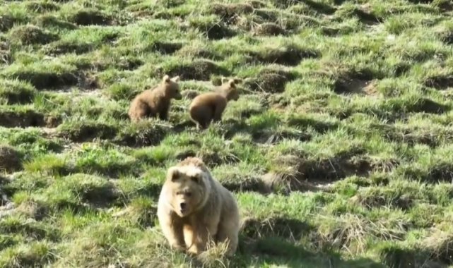 Hopur Yaylası'nda kaydedilen görüntülerde, anne ayının önde, yavrularının ise arkasında dağlık arazide ilerlediği görülüyor. Ayıların doğadaki hareketlerini uzaktan izleyen vatandaş, o anları cep telefonuyla kaydetti. Bir süre bölgede dolaşan ayılar, daha sonra ormanlık alana doğru ilerleyerek, gözden kayboldu.