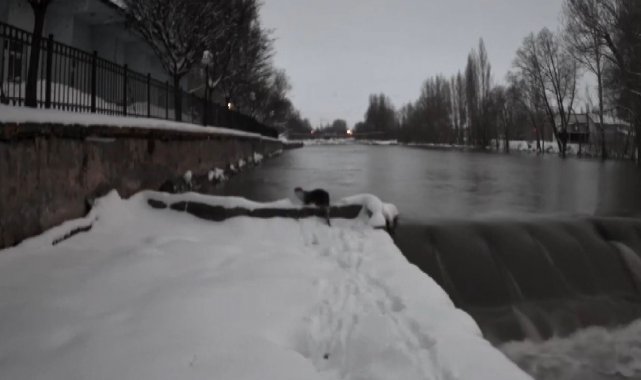 Çoruh Nehri'nin buz tutan kesimlerinde eğlenceli vakit geçiren su samurlarını vatandaşlar kaydederek anı ölümsüzleştirdiler.