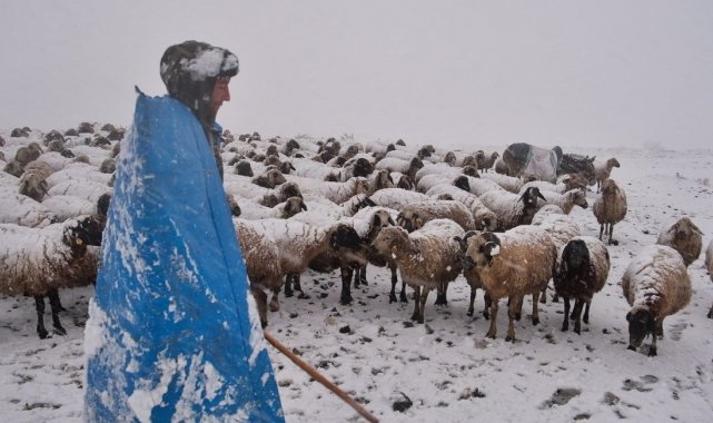 Bayburt'ta etkili olan yoğun kar yağışı kenti beyaza bürüdü. Nisan ayında yağan kar sebebiyle koyun sürüsü yaylada kar, tipiye yakalandı.