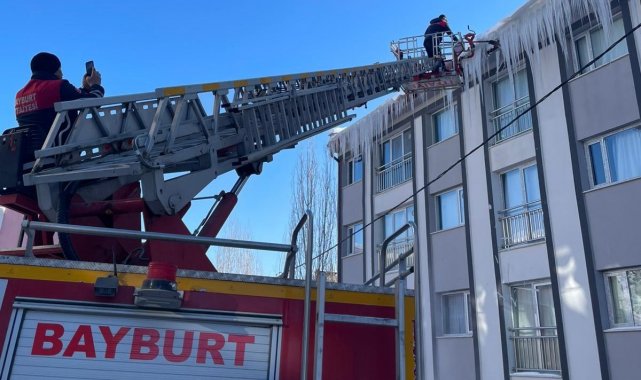 Bayburt'ta etkili olan soğuk hava nedeniyle bina saçaklarında oluşan buz sarkıtları, itfaiye ekipleri tarafından temizleniyor.