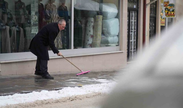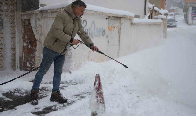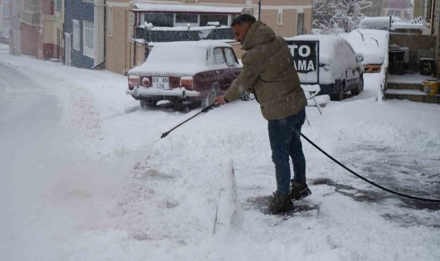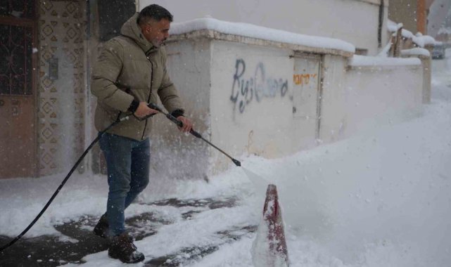Sürekli kar küremekten yorulan oto yıkama işletmecisi Karahan, iş yerinin önündeki kar birikintilerini kürek ve süpürge yerine, oto yıkamada kullanılan yüksek basınçlı su makinesiyle temizledi. Karı basınçlı suyla kısa sürede temizleyen Karahan, temizlik sonrası oluşabilecek buzlanmaya karşı da tuz dökerek önlem aldı.