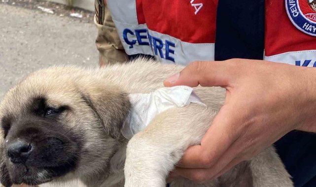Bayburt'ta yaralı yavru köpeğe hayvanları koruma timi müdahale etti.