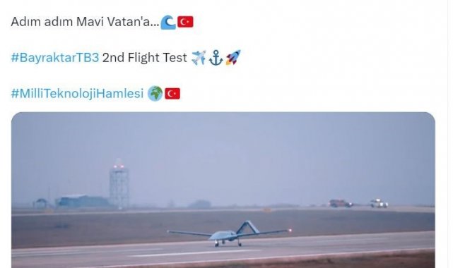 Baykar tarafından milli ve özgün olarak geliştirilen Bayraktar TB3 Silahlı İnsansız Hava Aracı (SİHA), ikinci uçuş testini başarıyla tamamladı. Baykar Yönetim Kurulu Başkanı ve Teknoloji Lideri Selçuk Bayraktar, "BayraktarTB3, 4 saat süren 2. uçuş testini de başarıyla tamamladı. Adım adım Mavi Vatan'a" dedi.