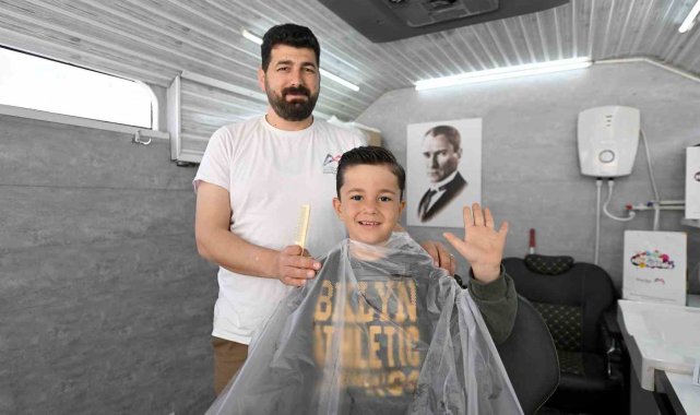 12 yaşındaki Mustafa Akagündüz, "Mobil Kuaför mahallemize geldi. Bayram tıraşı ile yakışıklı olduk" ifadelerini kullandı.