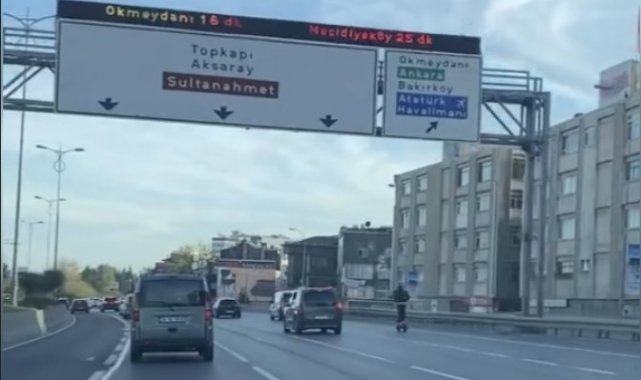 Olay, dün sabah saatlerinde Bayrampaşa O-3 yolu Adnan Menderes Bulvarı istikametinde meydana geldi. Elektrikli scooter sürücüsü, otoyolda araçların arasında ilerlerken başka bir sürücü tarafından cep telefonu kamerasıyla görüntülendi. Görüntüleri kaydeden sürücü, "Vatan Caddesi scooter'lı arkadaş canını tehlikeye atıyor. Bu arkadaşlardan çoğaldı bu aralar. Buna bir önlem alınmalı" diyerek duruma tepki gösterdi. Elektrikli scooter'la hem kendi canını hiçe sayan hem de trafik güvenliğini tehlikeye düşüren sürücünün o anları cep telefonu kamerasıyla kaydedildi.