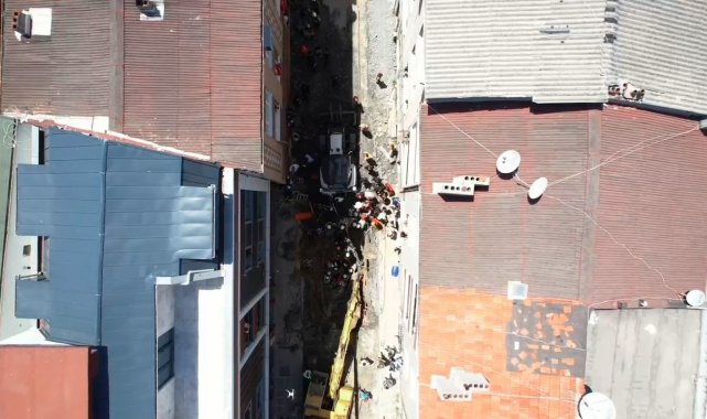İstanbul Bayrampaşa'da İSKİ ekiplerinin iş makinesi ile çalışma yaptıkları esnada göçük meydana geldi. Göçük altında kalan bir işçi itfaiye ekiplerinin çalışmaları sonrası kurtarılırken, kurtarılma çalışmaları ve işçinin göçükten çıkarılma anları havadan görüntülendi.