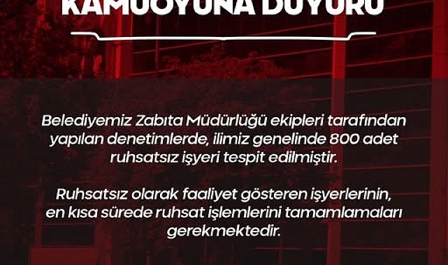 Belediyenin sosyal medya hesabından açıklama yapan Sevindi, "Ruhsatsız olarak faaliyet gösteren işyerlerinin, en kısa sürede ruhsat işlemlerini tamamlamaları gerekmektedir" ifadelerini kullandı.