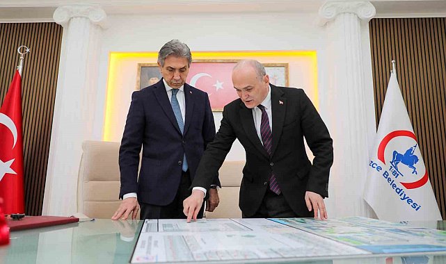 Yerel Yönetimler Başkan Yardımcısı Mücahit Yanılmaz'ın da katılımı ile başkanlık makamında gerçekleşen ve belediye başkan yardımcıları ile meclis üyelerinin de hazır bulunduğu ziyarette konuşan Düzce Belediye Başkanı Dr. Faruk Özlü, Cedidiye Kent Meydanı Projesi hakkında bilgiler sundu.