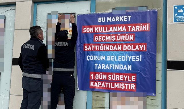 Çorum Belediyesi, son kullanma tarihi geçmiş ürün satan bir zincir market şubesine kapatma cezası uyguladı. Marketin kapılarını mühürleyen zabıta ekipleri, "Bu market, son kullanma tarihi geçmiş ürün sattığından dolayı Çorum Belediyesi tarafından 1 gün süreyle kapatılmıştır" yazılı büyük bir bilgilendirme afişi astı.