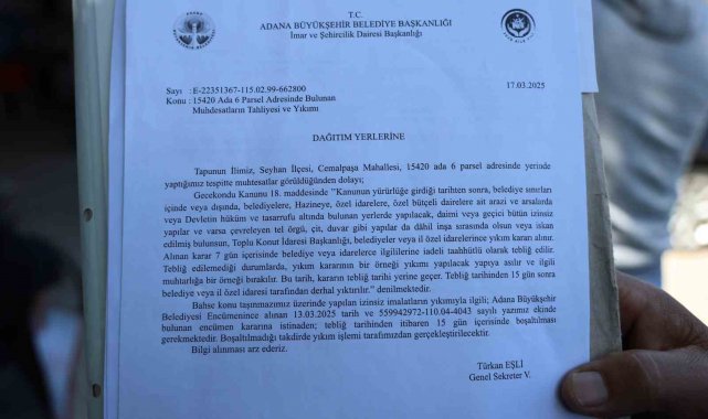 17 Mart tarihinde ise hak sahibi 9 kişiye, "Gecekondu Kanunu 18. maddesinde 'Kanunun yürürlüğe girdiği tarihten sonra, belediye sınırları içinde veya dışında, belediyelere, hazineye, özel idarelere, özel bütçeli dairelere ait arazi ve arsalarda veya devletin hüküm ve tasarrufu altında bulunan yerlerde yapılacak, daimi veya geçici bütün izinsiz yapılar ve varsa çevreleyen tel örgü, çit, duvar gibi yapılar da dahil inşa sırasında olsun veya iskan edilmiş bulunsun, Toplu Konut İdaresi Başkanlığı, belediyeler veya il özel idarelerince yıkım kararı alınır. Alınan karar 7 gün içerisinde belediye veya idarelerce ilgililerine iadeli taahhütlü olarak tebliğ edilir. Tebliğ edilmediği durumlarda, yıkım kararının bir örneği yıkımı yapılacak yapıya asılır ve ilgili muhtarlığa bir örneği bırakılır. Bu tarih, kararın tebliğ tarihi yerine geçer. Tebliğ tarihinden 15 gün sonra belediye veya il özel idaresi tarafından derhal yıktırılır' denilmektedir. Bahse konu taşınmazın üzerinde yapılan izinsiz imalatların yıkımıyla ilgili; Adana Büyükşehir Belediyesi encümenince alınan 13.03.2025 tarih ve 559942972-110.04-4043 sayılı yazımız ekinde bulunan encümen kararına istinaden; tebliğ tarihinden itibaren 15 gün içerisinde boşaltılması gerekmektedir. Boşaltılmadığı takdirde yıkım işlemi tarafımızca gerçekleştirilecektir" yazılı tebligat gönderildi.