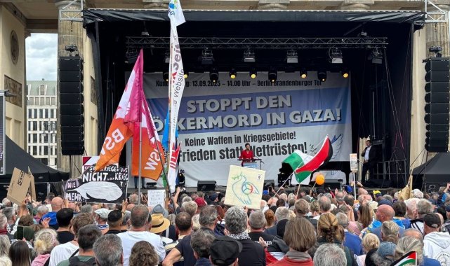Almanya'nın başkenti Berlin'de binlerce kişi, "Gazze'de Soykırımı Durdurun" çağrısı ile gösteri düzenledi. Berlin'deki tarihi Brandenburg kapısı önünde "Gazze'de soykırımı durdurun" sloganıyla gerçekleştirilen gösteride İsrail'in Gazze Şeridi'ndeki katliamlarına karşı tutarlı bir tepki göstermeyen Alman hükümeti protesto edildi. Göstericiler "Bomba yerine diplomasi, Gazze'de suça ortak olmayın İsrail'e silah vermeyin, Filistin özgür olacak, soykırımı durdurun" yazılı pankartlar taşıdı. Bazı katılımcılar ise barış güvercinlerinin resmedildiği pankartlarla gösteride yer aldı. Gösteride zaman zaman "Filistin'e özgürlük" ve "Silahlanma yerine barış" sloganları atıldı. Gösteride Almanya'nın Ukrayna politikası da eleştirildi. Almanya'nın İsrail ve Ukrayna başta olmak üzere savaş bölgelerine silah göndermesine tepki gösterildi.
