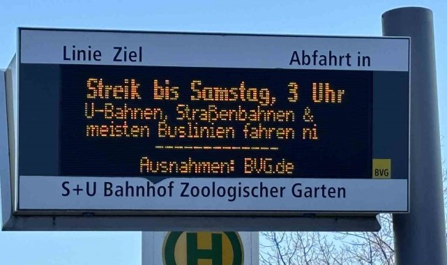 Almanya'nın başkenti Berlin'de toplu taşımada 48 saatlik grev başladı. Berlin Ulaşım İşletmeleri (BVG) çalışanlarının bugün saat 03:00'te başlayan iş bırakma eylemi nedeniyle başkentte otobüs, metro ve tramvay seferleri iptal oldu. Berlinliler metro (U-Bahn), tramvay (Straenbahn) ve otobüs hatlarını kullanamayacağı grev, 22 Şubat Cumartesi günü saat 03:00'te sona erecek.