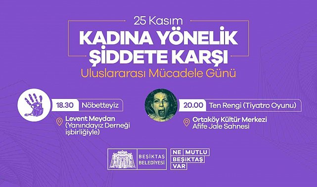 Beşiktaş Belediyesi tarafından 25 Kasım Kadına Yönelik Şiddete Karşı Uluslararası Mücadele Günü kapsamında bir dizi etkinlik düzenlenecek. 22 Kasım'da "Dünden Bugüne Kadına Yönelik Şiddetle Mücadele" paneliyle başlayacak olan etkinlikler 25 Kasım'da "Ten Rengi" adlı tiyatro oyunu gösterimiyle son bulacak.