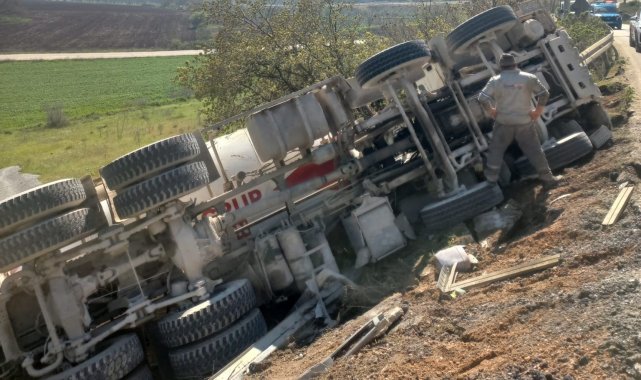 Bursa'nın İnegöl ilçesinde meydana gelen kazada kontrolden çıkan beton mikseri şarampole yuvarlandı.