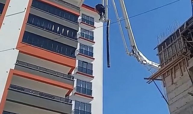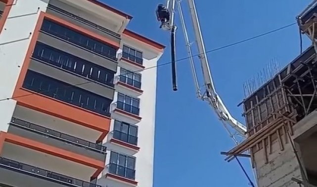 Beton pompasının üzerinde metrelerce yüksekliğe çıkan işçi, canını hiçe saydı