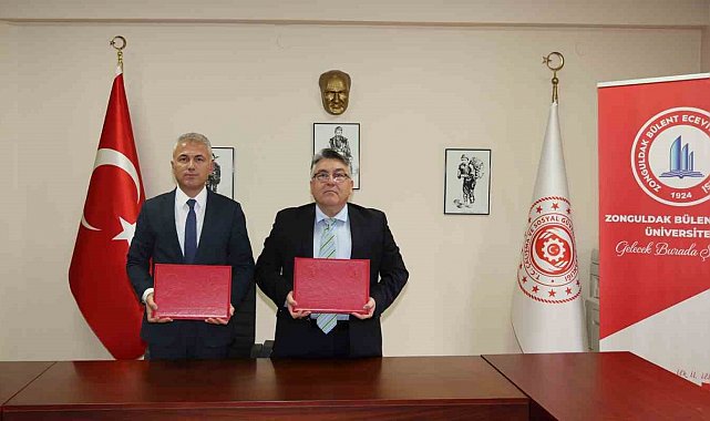 Ereğli Kömür Havzası Amelebirliği Biriktirme ve Yardımlaşma Sandığı Başkanlığında düzenlenen protokol imza töreninde Zonguldak Bülent Ecevit Üniversitesi Rektörü Prof. Dr. İsmail Hakkı Özölçer ile Amelebirliği Başkanı Veli Köktürk yer aldı.