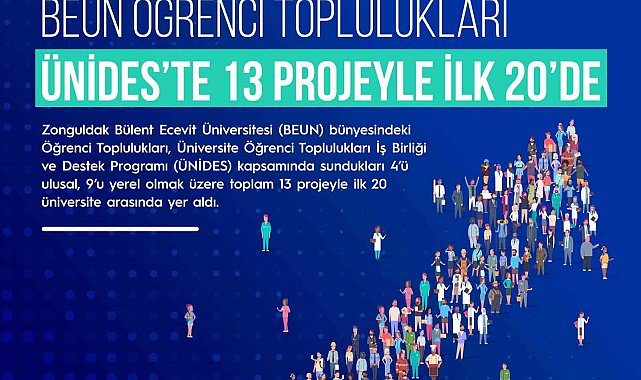 Zonguldak Bülent Ecevit Üniversitesi (BEUN) bünyesinde faaliyet gösteren öğrenci toplulukları, Öğrenci Toplulukları İş Birliği ve Destek Programı (ÜNİDES) kapsamında sundukları projelerle önemli bir başarıya imza attı. BEUN öğrenci toplulukları, destek almaya hak kazandıkları 4'ü ulusal, 9'u yerel olmak üzere toplam 13 proje ile Türkiye genelinde ilk 20 üniversite arasında yer aldı.