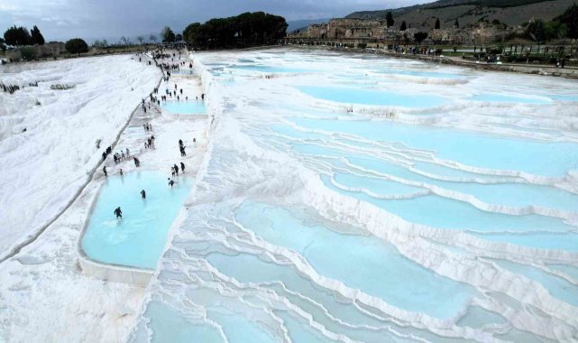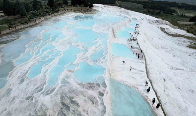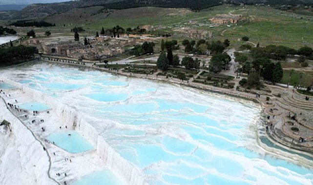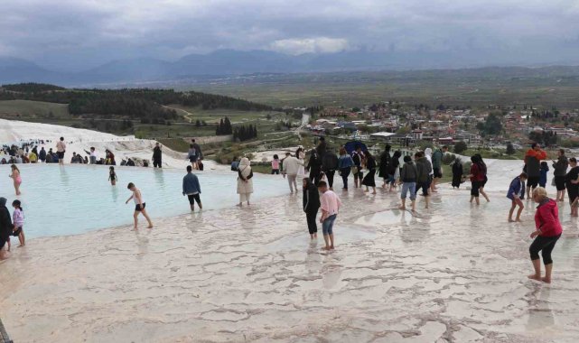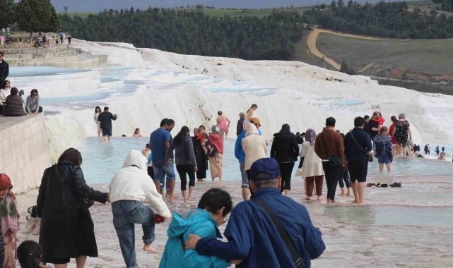 Denizli'nin dünyaca üne sahip turizm merkezi Pamukkale travertenleri ve Karahayit bölgesinde Ramazan Bayramı yoğunluğu yaşanıyor. Beyaz cennet Pamukkale travertenleri yağışlı havaya rağmen 5 günde 38 bin ziyaretçiyi ağırladı.