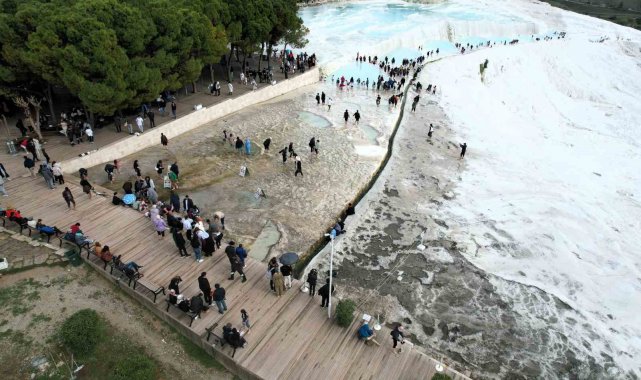 UNESCO Dünya Mirası Listesi'nde yer alan Pamukkale ve termal suyu ile ön plana çıkan Karahayit bölgesinde Ramazan Bayramı yoğunluğu yaşanıyor. Bayram tatilinde aileleriyle Pamukkale'ye tatile gelen misafirlerin genellikle yerli turist olması dikkatlerden kaçmadı. Travertenlerde ve ören yerini ziyaret eden misafirler hatıra fotoğrafları da çekerek bu anları ölümsüzleştirdi. Ara ara etkili olan yağışlı havaya rağmen beyaz cennetteki yoğunluk dikkatlerden kaçmadı. Ramazan bayramı olması sebebiyle yerli turistlerin ağırlıklı olması bölgedeki tesislerde doluluk oranını etkiledi. Beyaz cennet Pamukkale Ramazan Bayramı bir gün öncesinde 5 bin, bayramın birinci günü 7 bin, ikinci günü 12 bin, üçüncü ve dördüncü günü ise 7 bin ziyaretçiyi ağırladı. Yerli ve yabancı toplamda 38 bin ziyaretçi Pamukkale travertenleri ve ören yerini ziyaret etti.