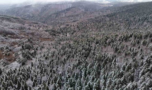 Beyaz örtüyle kaplanan ormanlar dronla görüntülendi