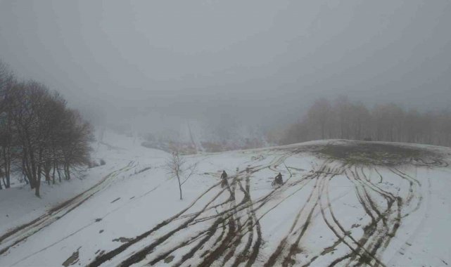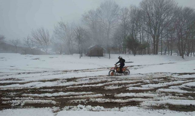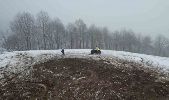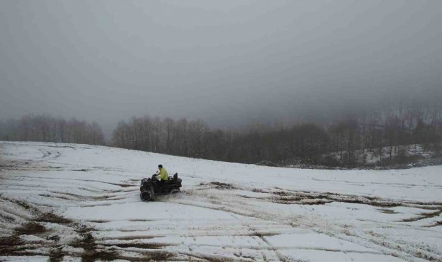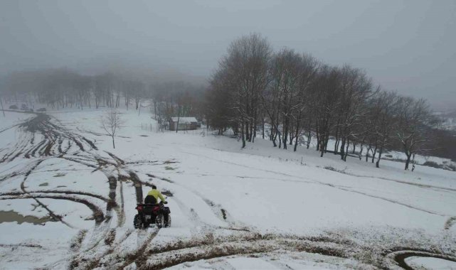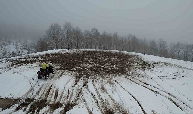 Meteoroloji Genel Müdürlüğü'nün uyarıları sonrasında Sakarya'da kar yağışı etkili oldu. Yağış ile birlikte beyaz örtüyle kaplanan Kırcaali Yaylası mevkiinde kartpostallık görüntüler ortaya çıktı. Seyrine doyumsuz manzaranın oluştuğu bölgede motosiklet ve ATV ile yapılan Off-Road keyfi dron ile görüntülendi.