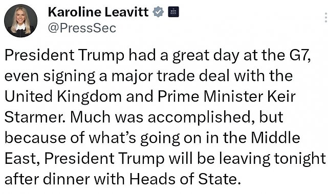 Beyaz Saray Sözcüsü Karoline Leavitt, ABD Başkanı Donald Trump'ın "Orta Doğu'da yaşanan gelişmeler nedeniyle" Kanada'daki G7 Zirvesi'nden erken ayrılacağını duyurdu.