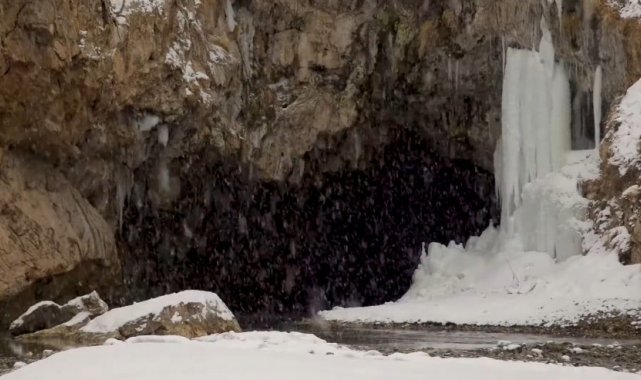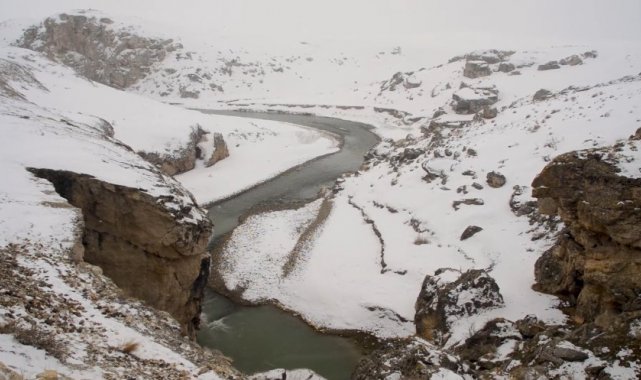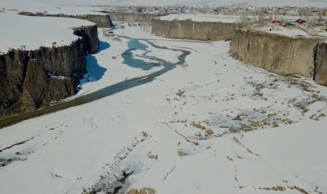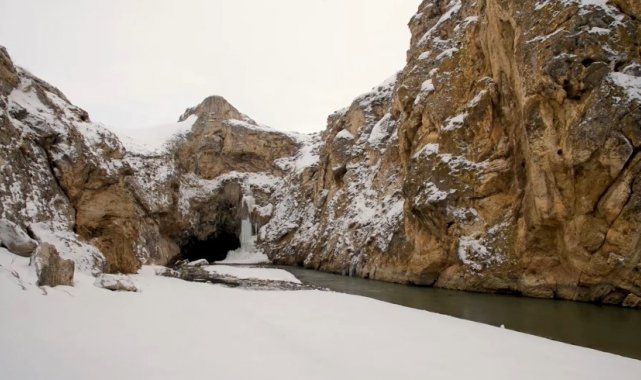 Ağrı'nın Diyadin ilçesinde bulunan kilometrelerce uzunluktaki Murat Kanyonu, karla kaplı görüntüsüyle doğa tutkunlarını ağırlıyor.