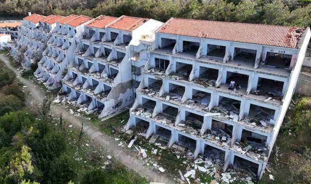 186 odalı dev tesisin içi ve dışı, kimliği belirsiz kişiler tarafından talan edildi. Camları kırılan, kapıları sökülen, odaları dağılan otelin son hali havadan görüntülendi.