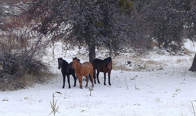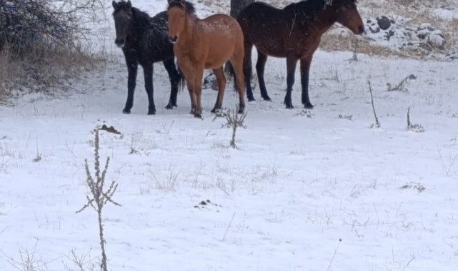 Ankara'nın Beypazarı ilçesinde kar altındaki yılkı atları kartpostallık görüntü oluşturdu.