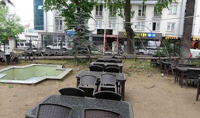 Bilecik'te bir çay bahçesinde bulunan 18 metrelik çam ağacı kökünden kırılarak devrildi.