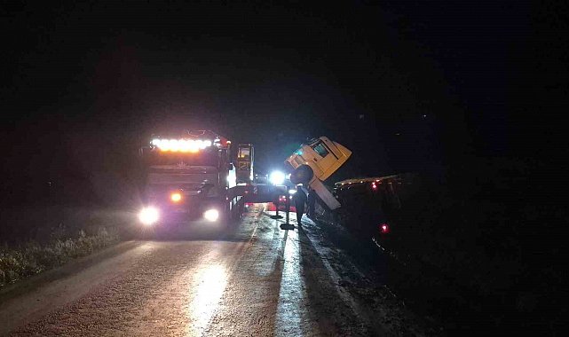 Kaza; dün gece yarısı Bilecik'in Osmaneli ilçesi İznik-Pamukova kara yolunda meydana geldi. Karayolunda seyir halindeki bir tırın sürücüsü aracın direksiyon hâkimiyetini kaybetti. Kontrolden çıkan araç devrilirken, şans eseri kazada ölen veya yaralanan olmadı. Tır çekici yardımıyla kaza yerinden kaldırılırken, bu esnada yol geçici olarak trafiğe kapatıldı. İznik- Pamukova kara yolu, çekiciye aracın kaldırılmasına ardından trafiğine açıldı.