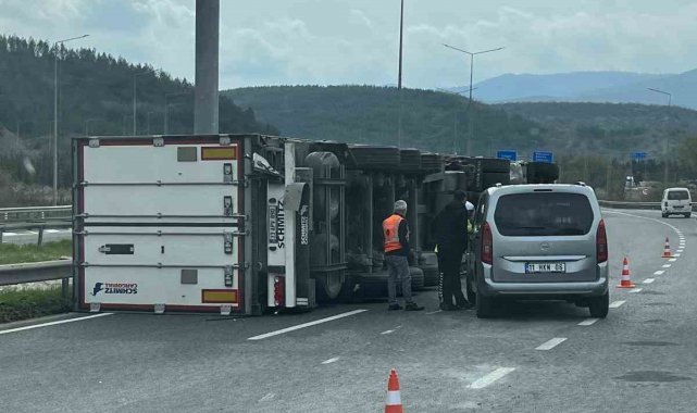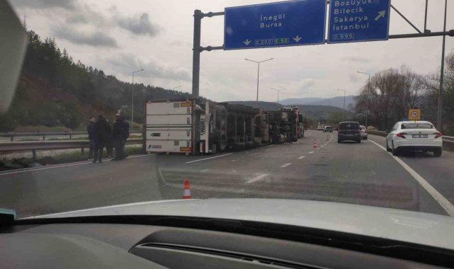Kaza, Bilecik Bozüyük çevre yolunda meydana geldi. Edinilen bilgilere göre, Bursa İnegöl istikametinde, halinde bulunan tır, sürücüsünün bir anlık direksiyon hakimiyetini kaybetmesi sonucu kontrolden çıkarak devrildi. İhbar üzerine olay yerine polis ekipleri sevk edilirken, bölgede güvenlik önlemleri alındı. Devrilen tır, olay yerine çağrılan üç vinç yardımıyla bulunduğu yerden kaldırıldı. Öte yandan, kaza nedeniyle bölgede trafik bir süre aksarken, çalışmaların tamamlanmasının ardından ulaşım normale döndü.