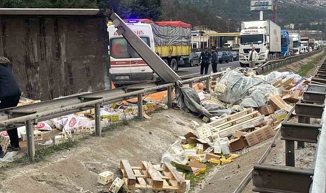 Bilecik'te seyir halindeki tır devrildi, baklagil ve kuruyemişler yola saçıldı. Yaşanan trafik kazasında tır sürücüsü yaralandı.