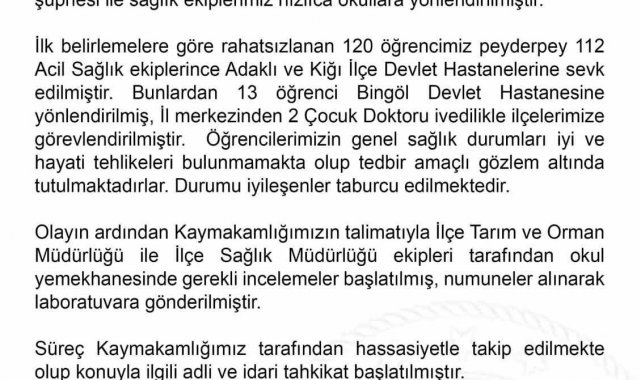 Bingöl Valiliğinden yapılan açıklamada, "Bugün Adaklı ilçemizde bulunan Yatılı Bölge Ortaokulu ve Şehit Hikmet Saydan İlk Okulu'nda verilen öğle yemeği sonrasında bazı öğrencilerimizde görülen mide bulantısı üzerine gıda zehirlenmesi şüphesi ile sağlık ekiplerimiz hızlıca okullara yönlendirilmiştir. İlk belirlemelere göre rahatsızlanan 120 öğrencimiz peyderpey 112 Acil Sağlık ekiplerince Adaklı ve Kiğı İlçe Devlet Hastanelerine sevk edilmiştir. Bunlardan 13 öğrenci Bingöl Devlet Hastanesine yönlendirilmiş, İl merkezinden 2 çocuk doktoru ivedilikle ilçelerimize görevlendirilmiştir. Öğrencilerimizin genel sağlık durumları iyi ve hayati tehlikeleri bulunmamakta olup tedbir amaçlı gözlem altında tutulmaktadırlar. Durumu iyileşenler taburcu edilmektedir" denildi.