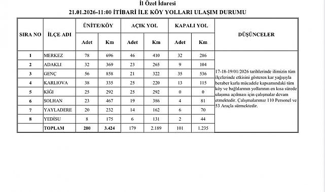 Bingöl'de İl Özel İdaresi ekipleri tarafından karla kaplı yolların açılması için çalışmalar sürüyor. 110 personel ve 53 araç ile yürütülen çalışmalarda 179 köy yolu ulaşıma açıldı. Gece gündüz mücadele veren ekipler, kapalı bulunan 101 köy yolunda ise çalışmalarını sürdürüyor.