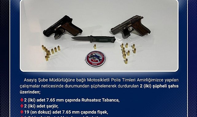 Edinilen bilgiye göre, Asayiş Şube Müdürlüğü Motosikletli Polis Timleri Amirliği ekiplerince durumundan şüphelenilen 2 şahıs durduruldu. Yapılan üst aramasında 2 adet ruhsatsız tabanca, şarjör ve fişek ele geçirildi. Şüpheliler hakkında adli işlem başlatıldığı öğrenildi.