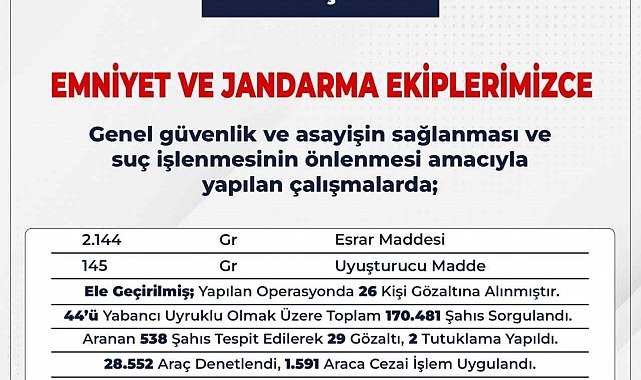 Bingöl'de emniyet ve jandarma ekiplerince genel güvenlik ve asayişin sağlanması ve suç işlenmesinin önlenmesi amacıyla çalışmalar sürüyor. Bu çerçevede 10-24 Şubat tarihleri arasında yapılan çalışmalarda 44'ü yabancı uyruklu olmak üzere toplam 170 bin 481 şahıs sorgulandı. Aranan 538 şahıs tespit edilerek 29 gözaltına alınırken 2'si tutuklandı. 28 bin 552 araç denetlenirken bin 591 araca cezai işlem uygulandığı ve 55 aracın trafikten men edildiği bildirildi. Ayrıca 2.144 gram esrar maddesi, 145 gram uyuşturucu madde ele geçirildi, yapılan operasyonda 26 kişi gözaltına alındı. Uygulamalarda 7 adet ruhsatsız av tüfeği, 116 adet av tüfeği fişeği, 4 adet tabanca, 12, adet fişek, 2 adet kuru sıkı tabanca ve 2 adet hassas terazinin ele geçirildiği aktarıldı.