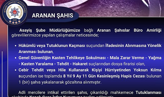 Bingöl'de 8 yıl 9 ay 11 gün kesinleşmiş hapis cezası bulunan zanlı, polis ekipleri tarafından yakalandı.
