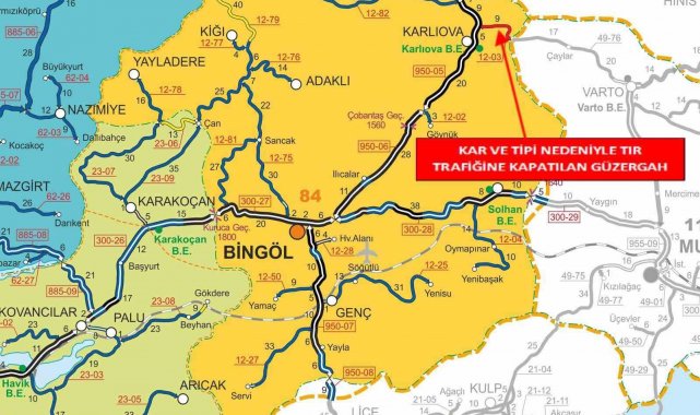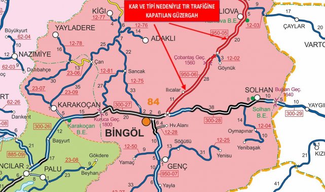 Yetkililerden alınan bilgiye göre, Bingöl-Erzurum Devlet Yolunun 0-88 kilometreleri arası (Kervansaray Kavşağı ile Bingöl-Erzurum il sınırı arası), yoğun kar yağışı ve tipi nedeniyle saat 16.50 itibarıyla tır trafiğine kapatıldı. Ayrıca, Bingöl-Elazığ Yolu'nun 0-46 kilometreleri arası da olumsuz hava koşulları sebebiyle geçici olarak ağır taşıt trafiğine kapatıldı.