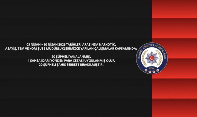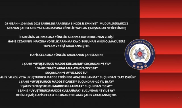 Bingöl İl Emniyet Müdürlüğü ekiplerince, 03 Nisan - 10 Nisan 2026 tarihleri arasında aranan şahısların yakalanmasına yönelik gerçekleştirilen çalışmalar kapsamında önemli sonuçlar elde edildi. Yapılan çalışmalarda, ifadesinin alınmasına yönelik aranan 21 kişi ile kesinleşmiş hapis cezası bulunan 6 kişi olmak üzere toplam 27 şahıs yakalandı.