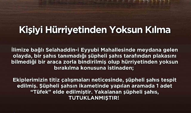 Olay, merkez Selahaddin-i Eyyubi Mahallesi'nde meydana geldi. Edinilen bilgiye göre, bir şahıs tanımadığı şüpheli şahıs tarafından plakasını bilmediği bir araca zorla bindirildi. Ardından polis ekipleri tarafından yapılan çalışmada, şüpheli şahıs tespit edildi. Şüpheli şahıs yakalanarak gözaltına alındı. İkametinde yapılan aramada 1 adet tüfek ele geçirildi. İl Emniyet Müdürlüğü'ndeki işlemlerinin ardından adliyeye sevk edilen şüpheli tutuklanarak cezaevine gönderildi.