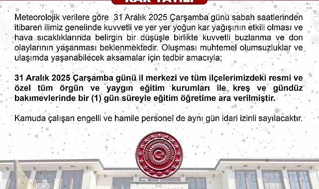 Bingöl tarafından yapılan açıklamada, "Meteorolojik verilere göre 31 Aralık 2025 Çarşamba günü sabah saatlerinden itibaren ilimiz genelinde kuvvetli ve yer yer yoğun kar yağışının etkili olması ve hava sıcaklıklarında belirgin bir düşüşle birlikte kuvvetli buzlanma ve don olaylarının yaşanması beklenmektedir. Oluşması muhtemel olumsuzluklar ve ulaşımda yaşanabilecek aksamalar için tedbir amacıyla; 31 Aralık 2025 Çarşamba günü il merkezi ve tüm ilçelerimizdeki resmi ve özel tüm örgün ve yaygın eğitim kurumları ile kreş ve gündüz bakımevlerinde 1 gün süreyle eğitim öğretime ara verilmiştir" denildi.
