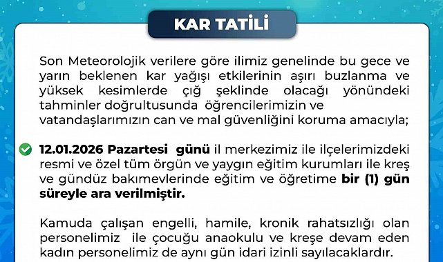 Bingöl Valiliği'nden yapılan açıklamada, "Son meteorolojik verilere göre ilimiz genelinde bu gece ve yarın beklenen kar yağışı etkilerinin aşırı buzlanma ve yüksek kesimlerde çığ şeklinde olacağı yönündeki tahminler doğrultusunda öğrencilerimizin ve vatandaşlarımızın can ve mal güvenliğini koruma amacıyla 12.01.2026 Pazartesi günü il merkezimiz ile ilçelerimizdeki resmi ve özel tüm örgün ve yaygın eğitim kurumları ile kreş ve gündüz bakımevlerinde eğitim ve öğretime 1 gün süreyle ara verilmiştir. Kamuda çalışan engelli, hamile, kronik rahatsızlığı olan personelimiz ile çocuğu anaokulu ve kreşe devam eden kadın personelimiz de aynı gün idari izinli sayılacaklardır" denildi.