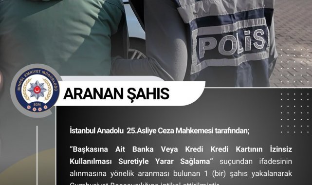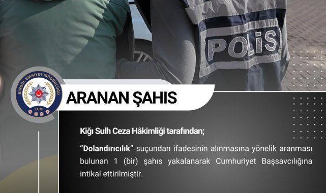 Bingöl Emniyet Müdürlüğü ekiplerince gerçekleştirilen operasyonlarda, başkasına ait kredi kartının izinsiz kullanılması suretiyle yarar sağlama, kadına karşı tehdit, dolandırıcılık ve suç eşyasının satın alınması veya kabul edilmesi suçlarından haklarında arama kaydı bulunan 4 kişi yakalandı.