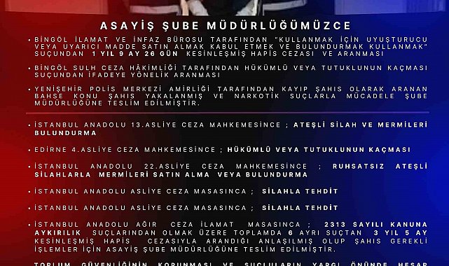 Bingöl'de polis ekipleri arama kaydı bulunan şahıslara göz açtırmıyor. Bu çerçevede haklarında çeşitli suçlardan 1 yıl 9 ay 26 gün ve 3 yıl 5 ay kesinleşmiş hapis cezası bulunan 2 kişi yakalandı. Şahısların emniyetteki işlemlerinin devam ettiği belirtildi.