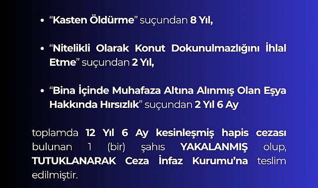 Bingöl İl Emniyet Müdürlüğü Asayiş Şube Müdürlüğü arana şahısların yakalanması için çalışmalarını sürdürüyor. Ekipler bu kapsamda "Kasten öldürme" suçundan 8 yıl, "Nitelikli olarak konut dokunulmazlığını ihlal etme" suçundan 2 yıl, "Bina içinde muhafaza altına alınmış olan eşya hakkında hırsızlık" suçundan ise 2 yıl 6 ay olmak üzere toplam 12 yıl 6 ay kesinleşmiş hapis cezası bulunan şahsı yakaladı. Şahıs emniyetteki işlemlerinin ardından sevk edildiği adli makamlarca tutuklanarak ceza infaz kurumuna teslim edildi.