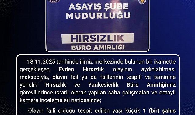 Bingöl İl Emniyet Müdürlüğü'nden yapılan açıklamada, "18.11.2025 tarihinde ilimiz merkezinde bulunan bir ikamette gerçekleşen Evden Hırsızlık olayının aydınlatılması maksadıyla, olayın fail ya da faillerinin tespiti ve teminine yönelik Hırsızlık ve Yankesicilik Büro Amirliğimiz görevlilerince ısrarlı olarak yapılan saha çalışmaları ve detaylı kamera incelemeleri neticesinde; olayın faili olduğu tespit edilen yaşı küçük 1 şahıs yakalanmış ve adli mercilerin talimatları doğrultusunda şahıs hakkında SSÇ sıfatıyla gerekli iş ve işlemler gerçekleştirilmiştir. Benzer suç konularından çok sayıda suç kaydı bulunan SSÇ şahıs Çocuk Şube Müdürlüğümüz görevlileri tarafından çıkarıldığı adli mercilerce tutuklanmış olup, Diyarbakır Kapalı Çocuk Cezaevine teslim edilecektir" denildi.